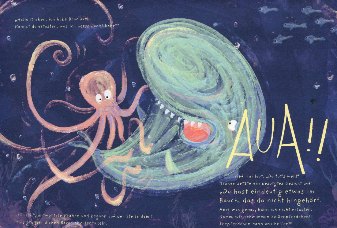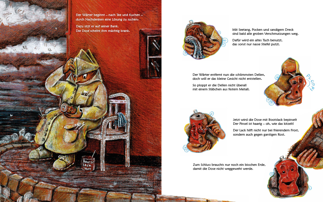 Vier gedruckte Doppelseiten des Bilderbuchs in geplanter Buchgröße, in Farbe, inklusive Text und in fertiger Seitengestaltung